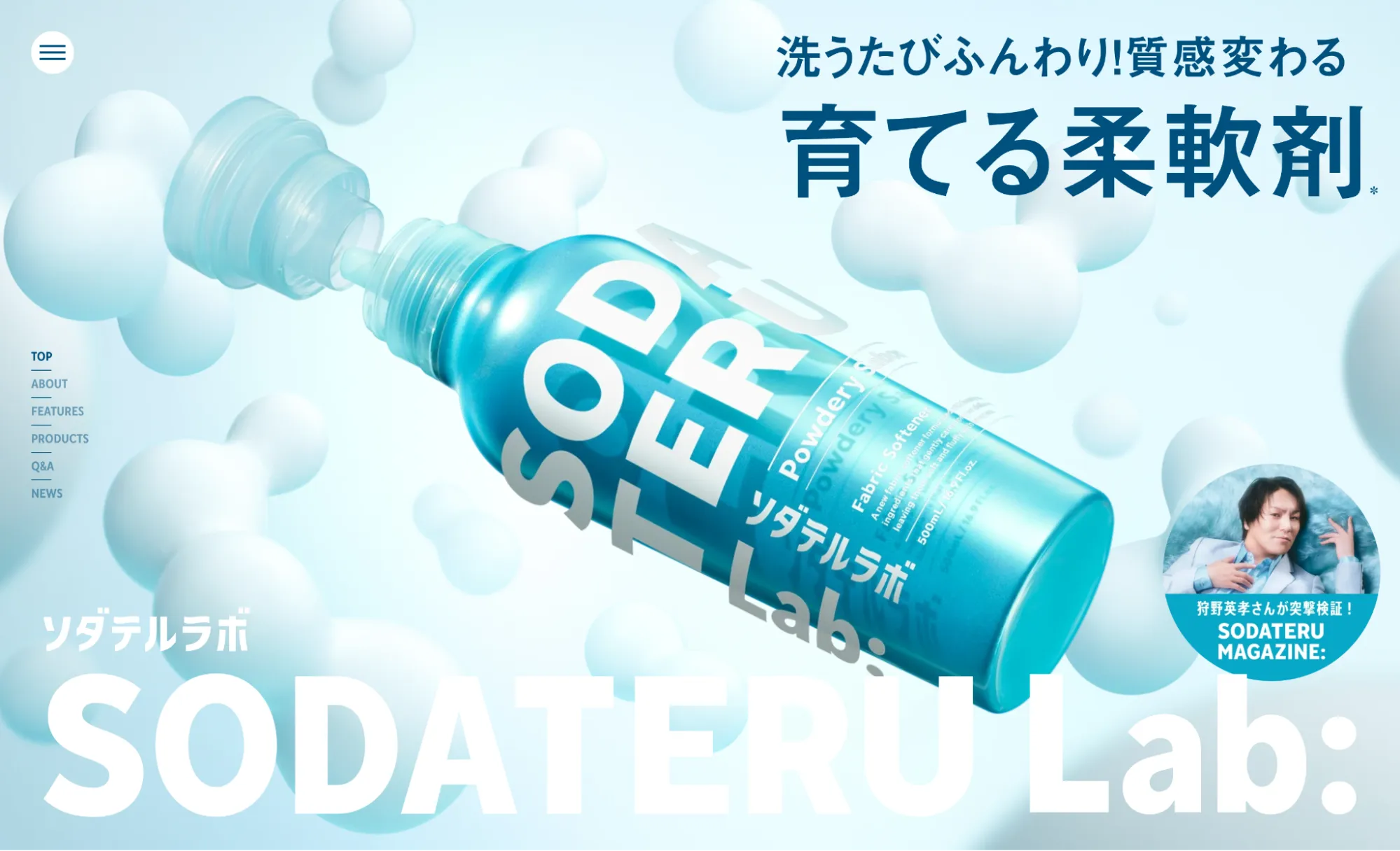 「パフィー=ぷっくりとした」質感です。AIによる整いすぎたデザインに対する遊び心として、クッションのような柔らかさを取り入れます。冷たい画面の向こう側に「温もり」を感じさせ、ユーザーとの距離を縮めます。「ソダテルラボ」公式サイトは、まさにパフィーの世界観を体現したサイトです。画面を漂うしずくや泡の造形は、まるで指で触れれば弾むような弾力性を感じさせています。