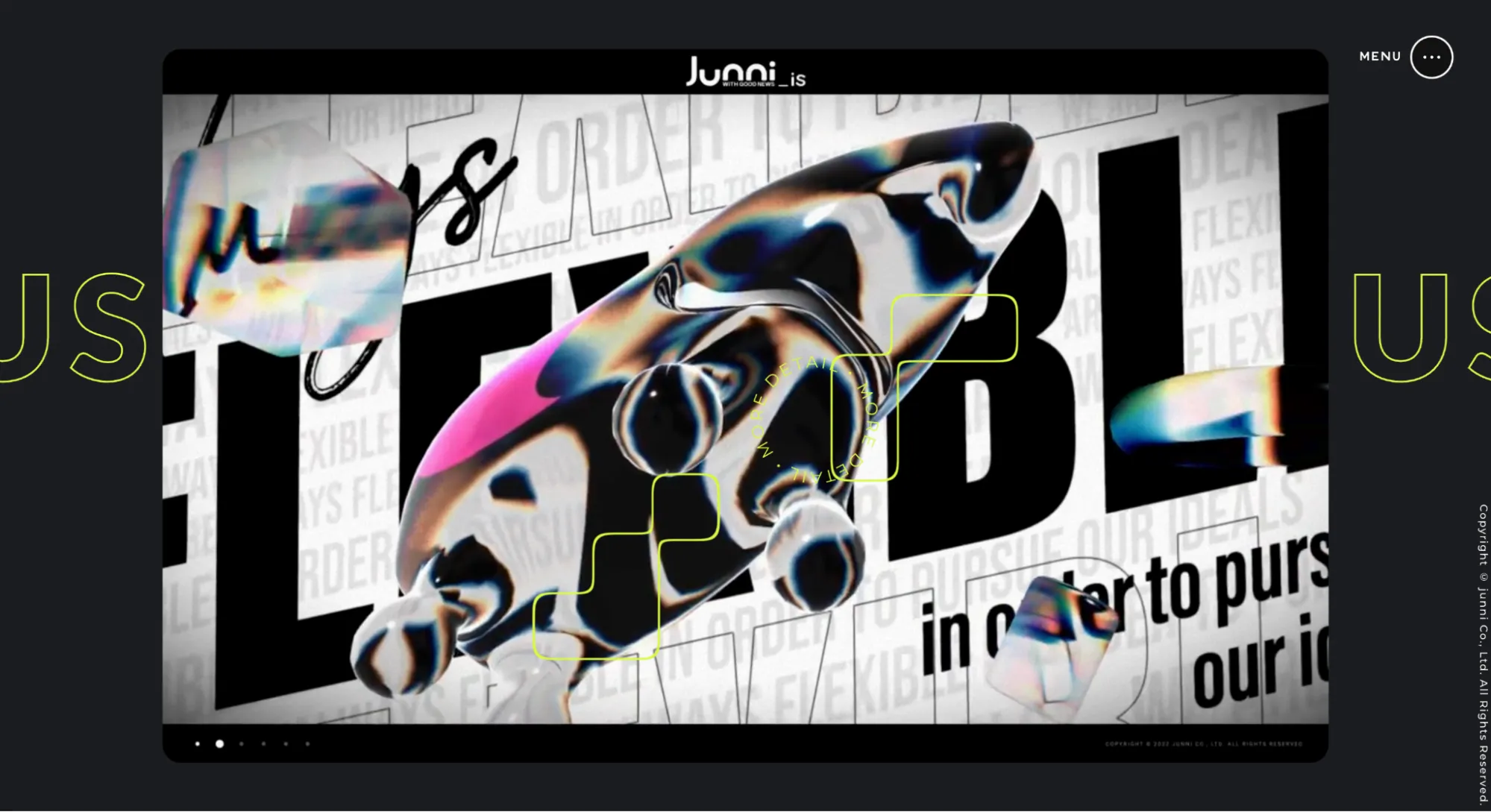 その中でも、「株式会社ジュニ」のサイトは、ネオン表現に頼らず、構造やタイポグラフィで再構築された、洗練された現代解釈版レトロフューチャリズムといえるでしょう。