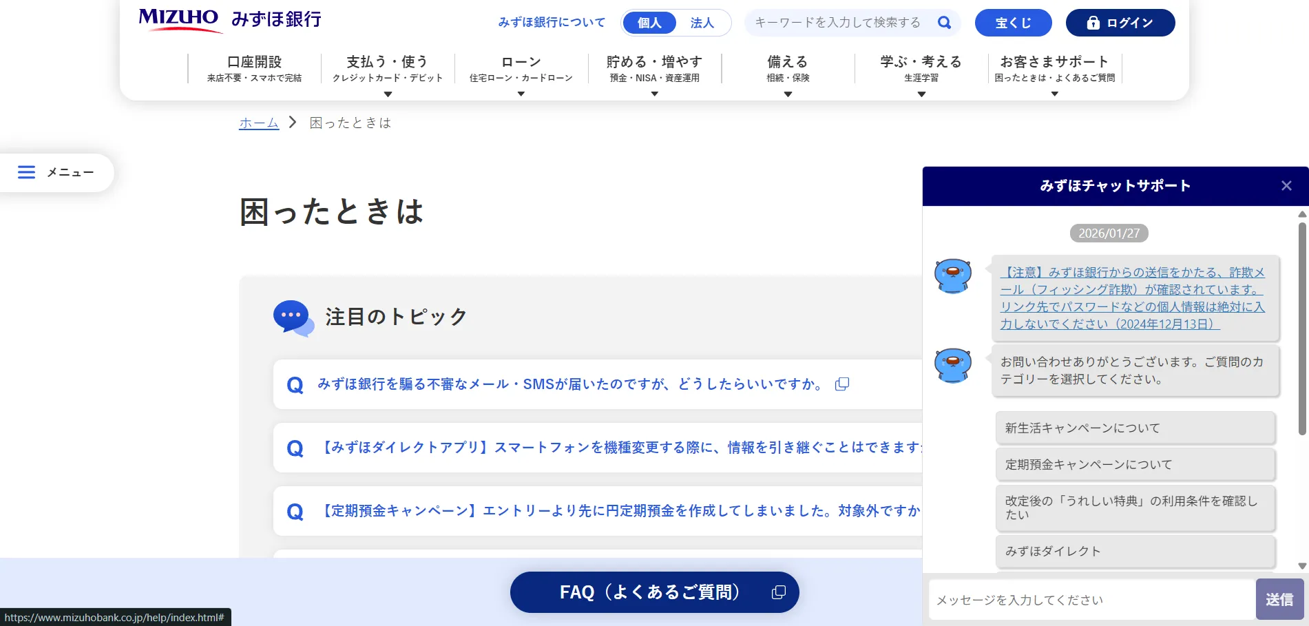 みずほ銀行のヘルプデスクでは、オリジナルキャラクター「あおまる」を模したAIチャットボットが顧客対応を行っています。ATMの手数料や店舗検索、口座開設の手順といった質問に対し、メニュー選択と自由入力のハイブリッド型で適切なWebページや申請フォームへ誘導します。