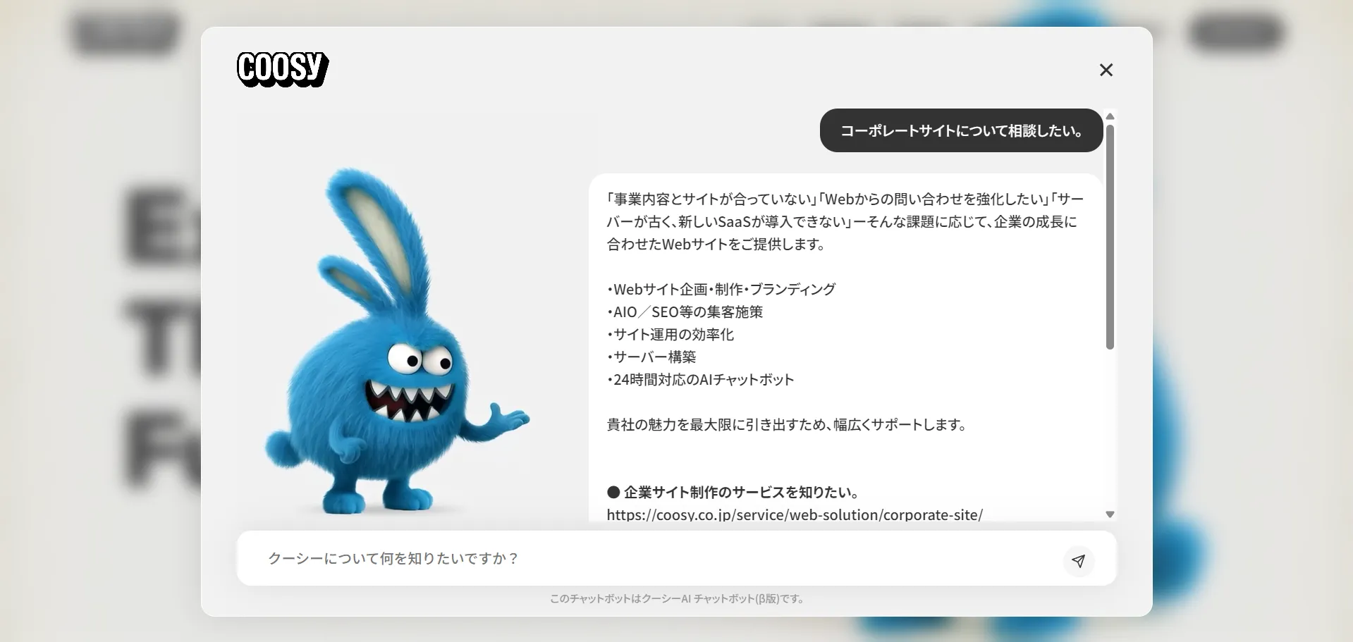 当社クーシーでもオリジナルのキャラクター「マル」がチャットボットとして稼働しており、サービスの詳細や会社概要、お問い合わせ窓口の案内まで、昼夜を問わず24時間体制でお答えしています。さらに、単なる案内役にとどまらず、「このAIシステム自体がどのような仕組みで動いているのか」といった技術的な背景についても自ら説明できるようにしており、会社についての問い合わせだけでなく、楽しい話し相手にもなれるのが特徴です。