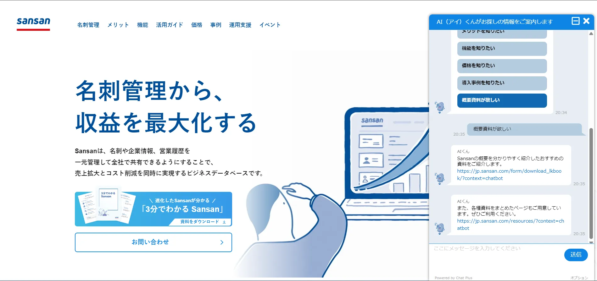 | 売上拡大とリード獲得 | 会話の中で問い合わせフォームへ誘導し、関連商品を提案。コンバージョンを向上 |