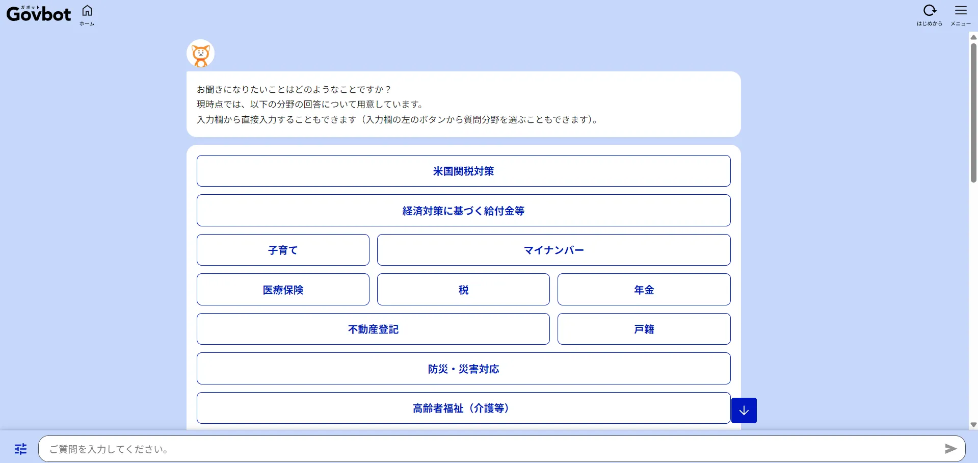 日本政府の公式生成AIツールとして誕生したのが、国・地方共通相談チャットボット「Govbot(ガボット)」です。RAG(検索拡張生成)という技術を活用することで、膨大に存在する数千もの行政文書の中から根拠となる情報を探し出し、極めて正確な回答を生成します。所得税の計算や子育て給付金の申請、マイナンバーカードの手続きなど、国民の生活に関わる複雑な案内を24時間いつでも提供できる体制を実現しています。
