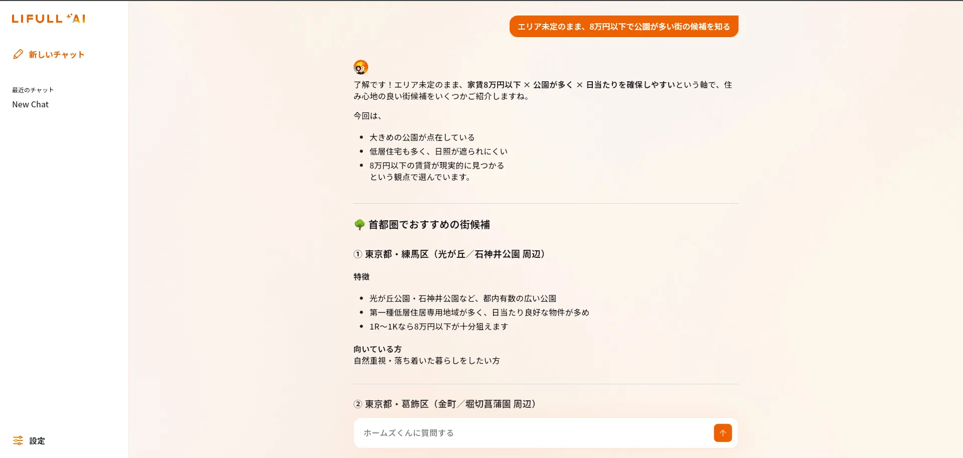 LIFULL HOME’Sが提供する「AIホームズくん」は、これまでの「条件にチェックを入れて絞り込む」という家探しの流れを変える新しいアプローチをとっています。「公園の近くで日当たりが良く、家賃は8万円以下がいいな」といったように、ユーザーが頭に描く「理想の暮らし」をチャットでつぶやくだけで、AIがその言葉の裏にある潜在的なニーズまで解釈し、条件にあった物件を次々と提案してくれます。