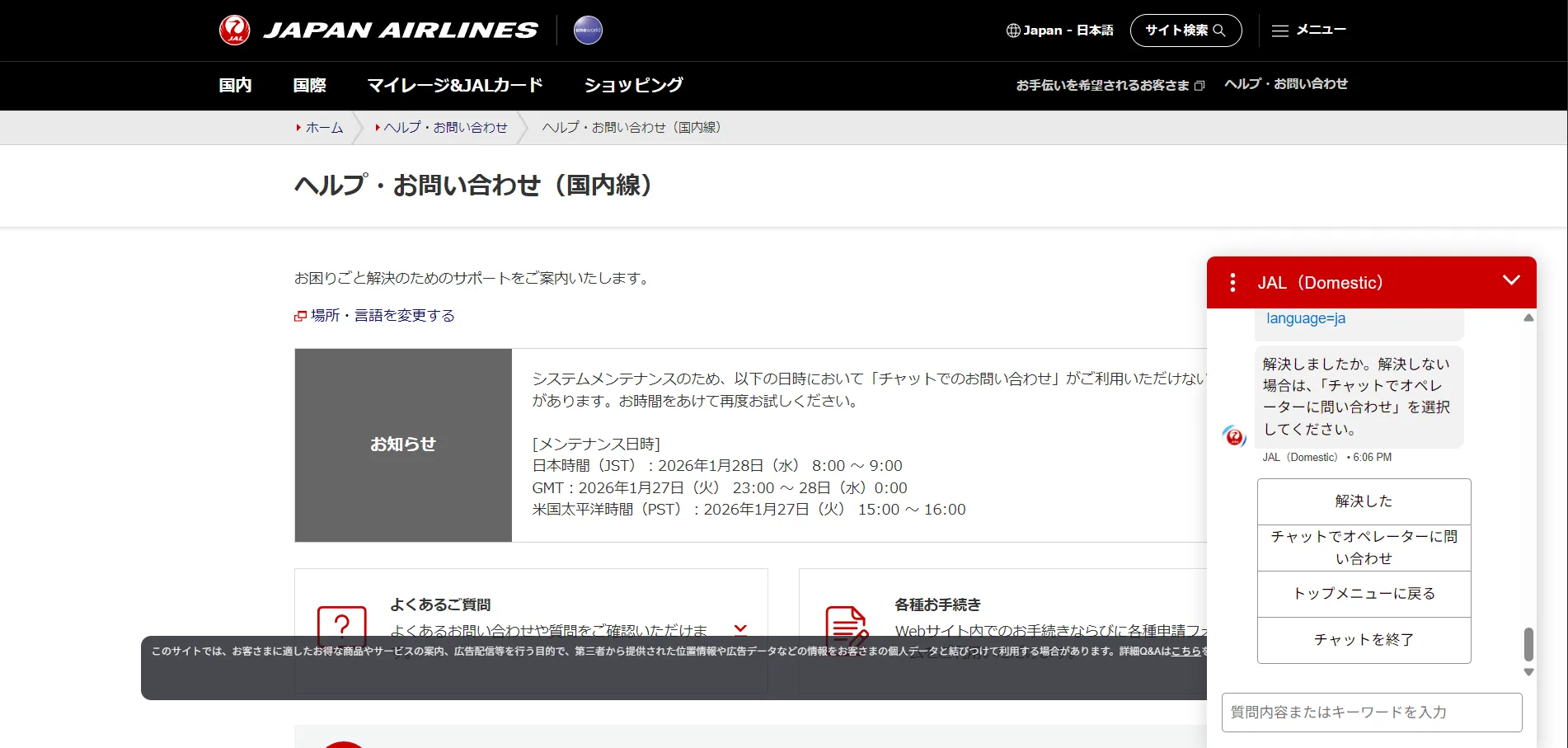 日本航空(JAL)では、サポートページにチャットボットが設置されており、フライト予約や手荷物、マイレージに関する顧客からの問い合わせに対応しています。よくある質問から選ぶメニュー形式と、キーワード検索を組み合わせた「ハイブリッド型」を採用しているのが特徴で、これによりユーザーは変更や払い戻しといった知りたい情報へスムーズにたどり着けるようになり、結果としてコールセンターへの入電数を抑えることに成功しています。