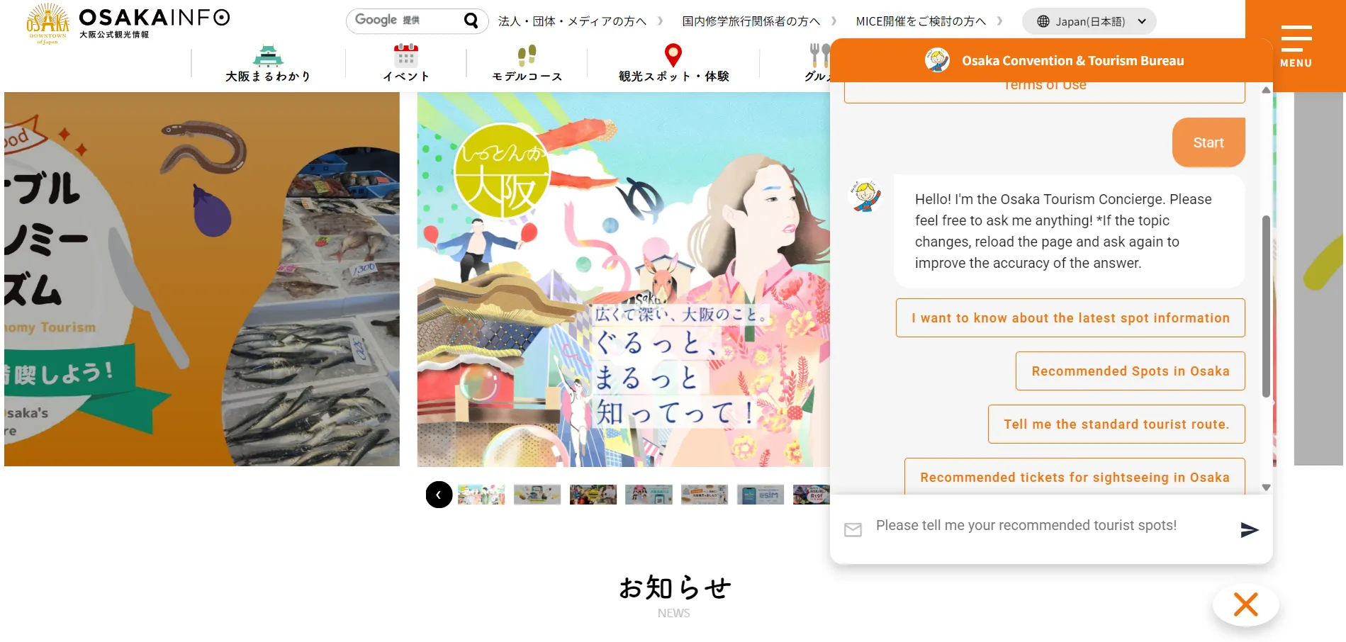大阪の公式観光サイトでは、急増する外国人旅行者に向けた多言語対応のチャットボットが導入されています。