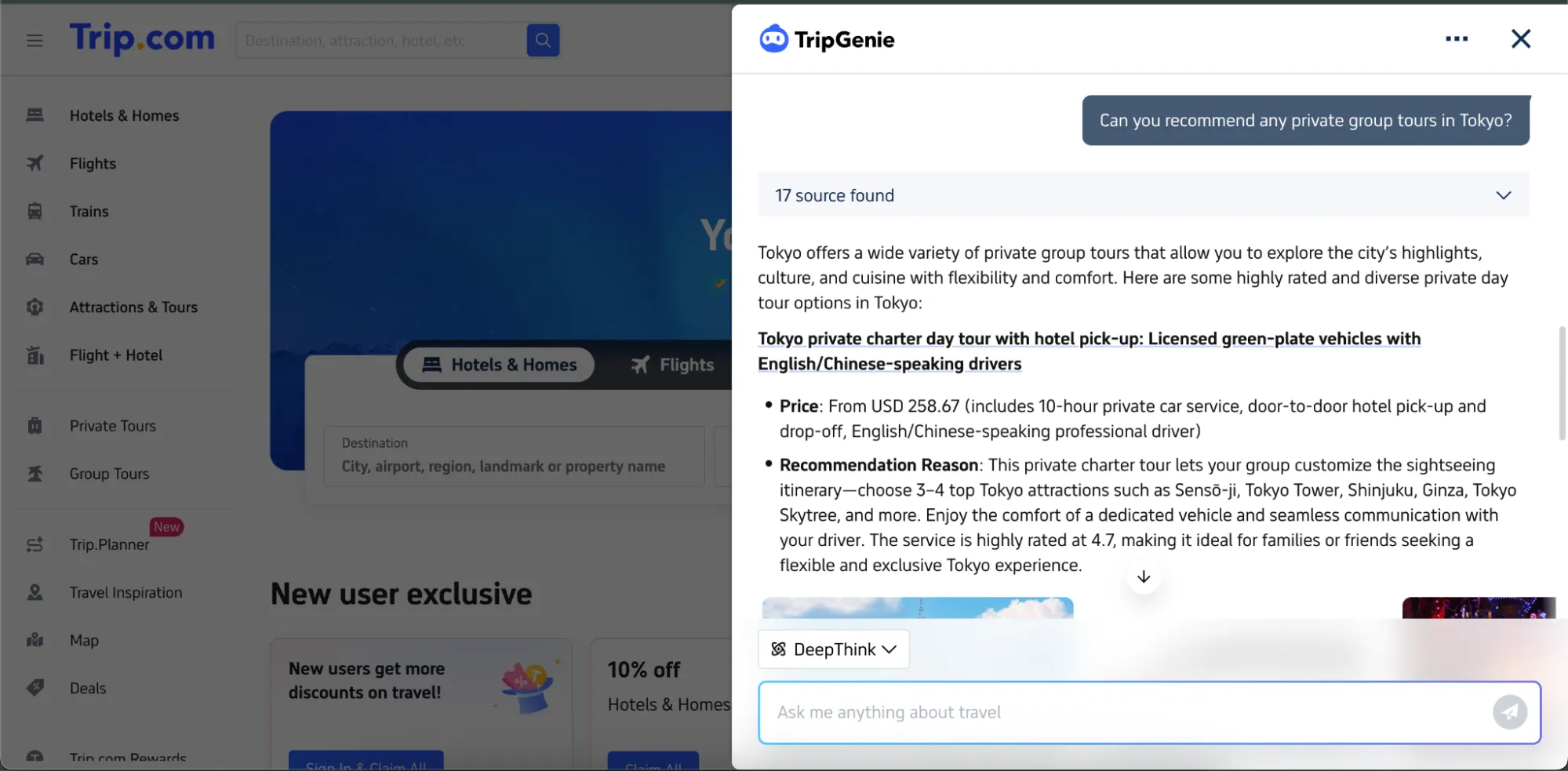 Trip.comが導入した生成AIアシスタント「TripGenie」はJALの事例と同様に、ユーザーの旅行プランの作成から予約までを一貫してサポートしています。