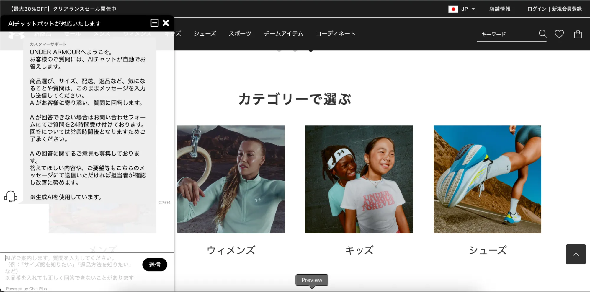 UNDER ARMOURの公式オンラインストアでは、AIチャットボットを活用した24時間体制の問い合わせ窓口を実現。それだけでなく、ユーザーとの会話を通じて顧客一人ひとりのライフスタイルに合わせた商品提案までも行っている点が特徴です。