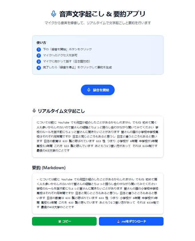 | Next.js+Tailwind+shadcn/uiで、音声ファイル(.mp3/.m4a)をアップロードしたらWebSpeechAPIで日本語文字起こしして、自動で箇条書き要約+Markdownダウンロードできるアプリを作ってください。 |