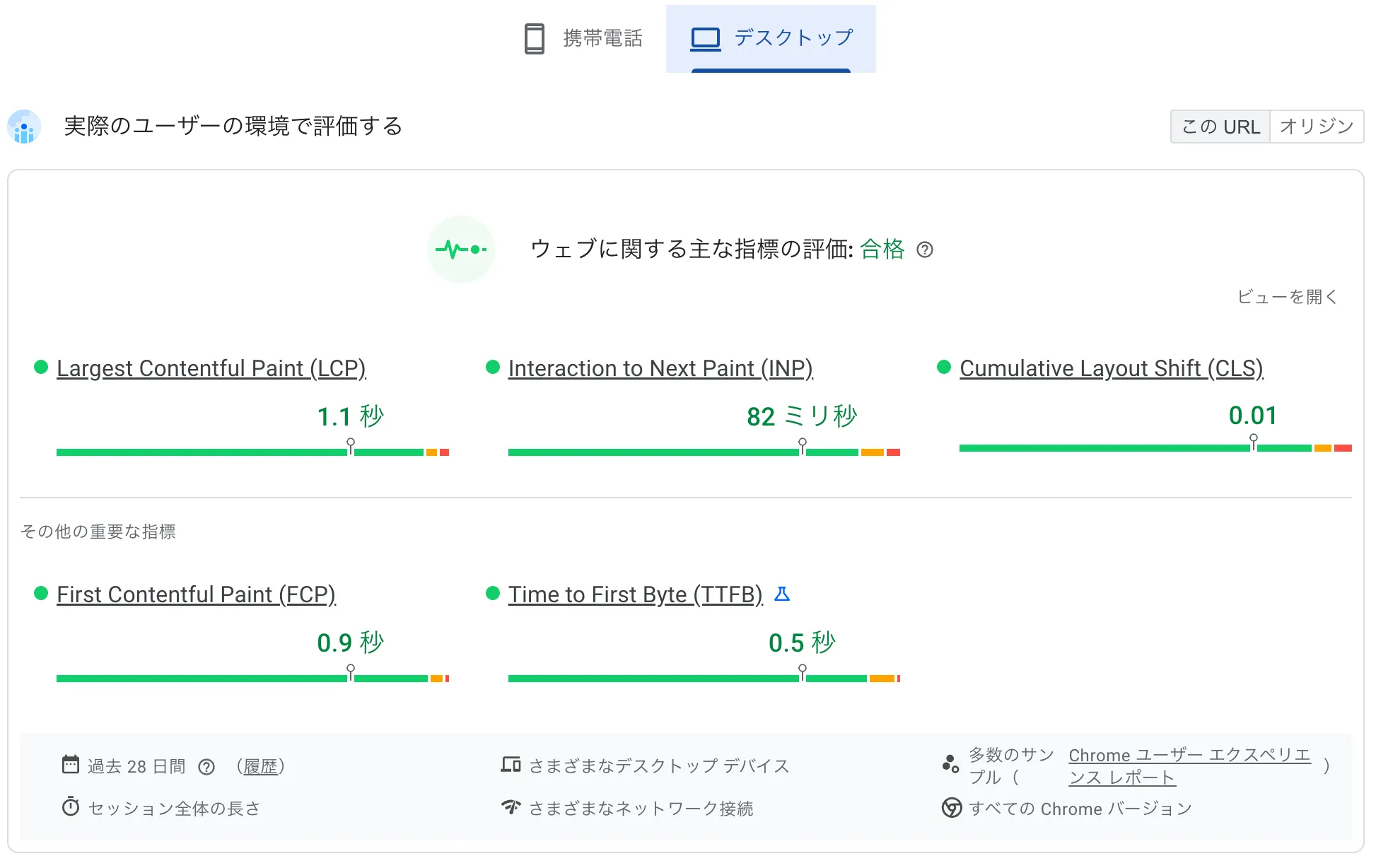 「自分のPCでは速く表示されるのに、ユーザーのスマホでは遅い」ということはよくあります。フィールドデータを見ることで、実際のユーザーが体験しているパフォーマンスを把握できるのがこのツールの大きな利点です。