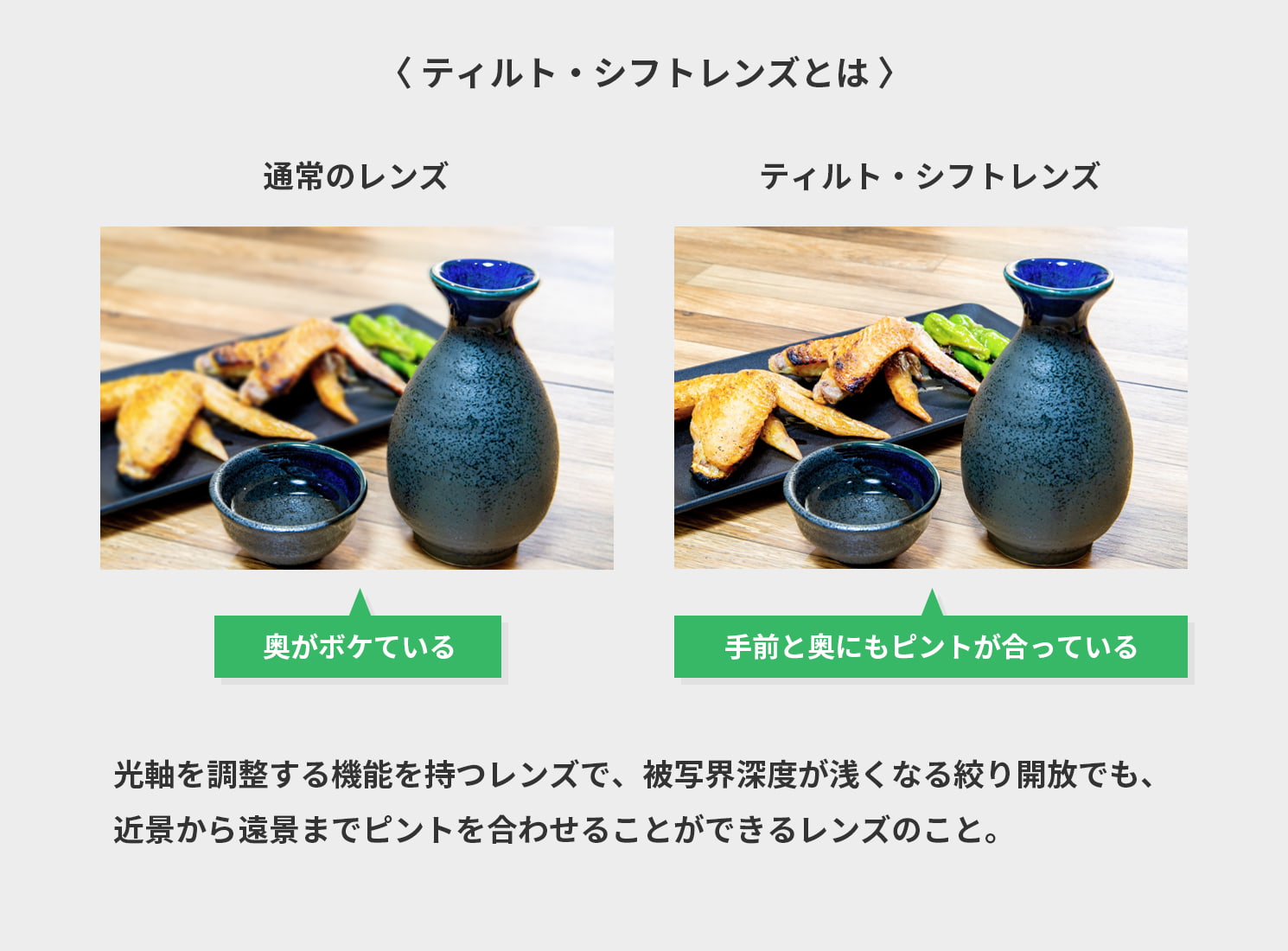 これにより、奥行きがあっても被写界深度内に商品が入るようにしているのです。とても高価ですし、取り扱いも難しいレンズのため、物撮りのプロしか所有していないレンズではないでしょうか。
