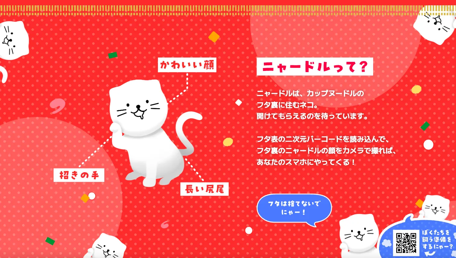ニャードルは、カップヌードルのフタ裏に住むネコ。開けてもらえるのを待っています。