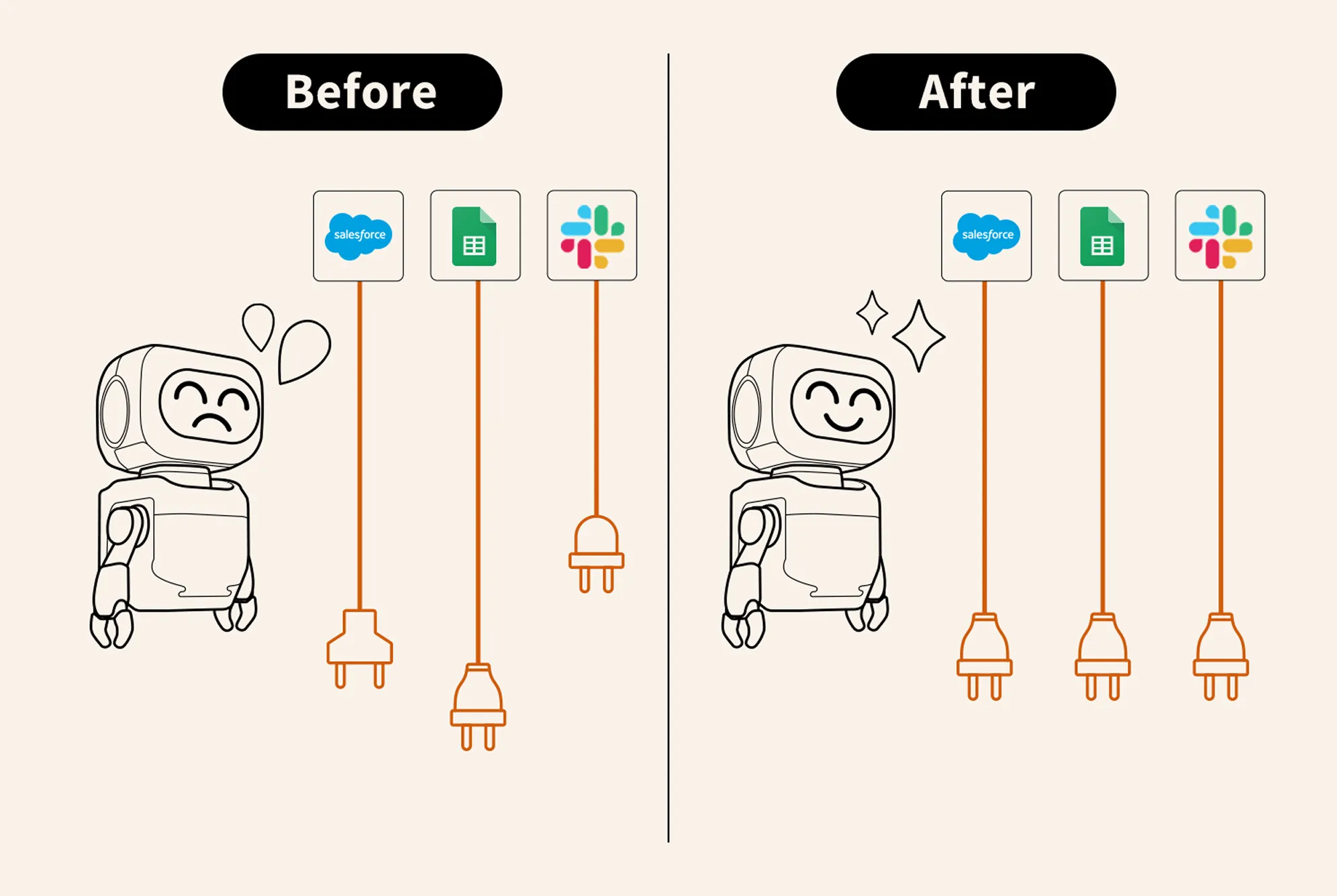 この問題は、AI活用が本格化すればするほど顕著になります。せっかく技術が発展しAIにできる仕事が増えたとしても、外部ツールとの連携が複雑なままでは、業務自動化の範囲は拡大していきません。