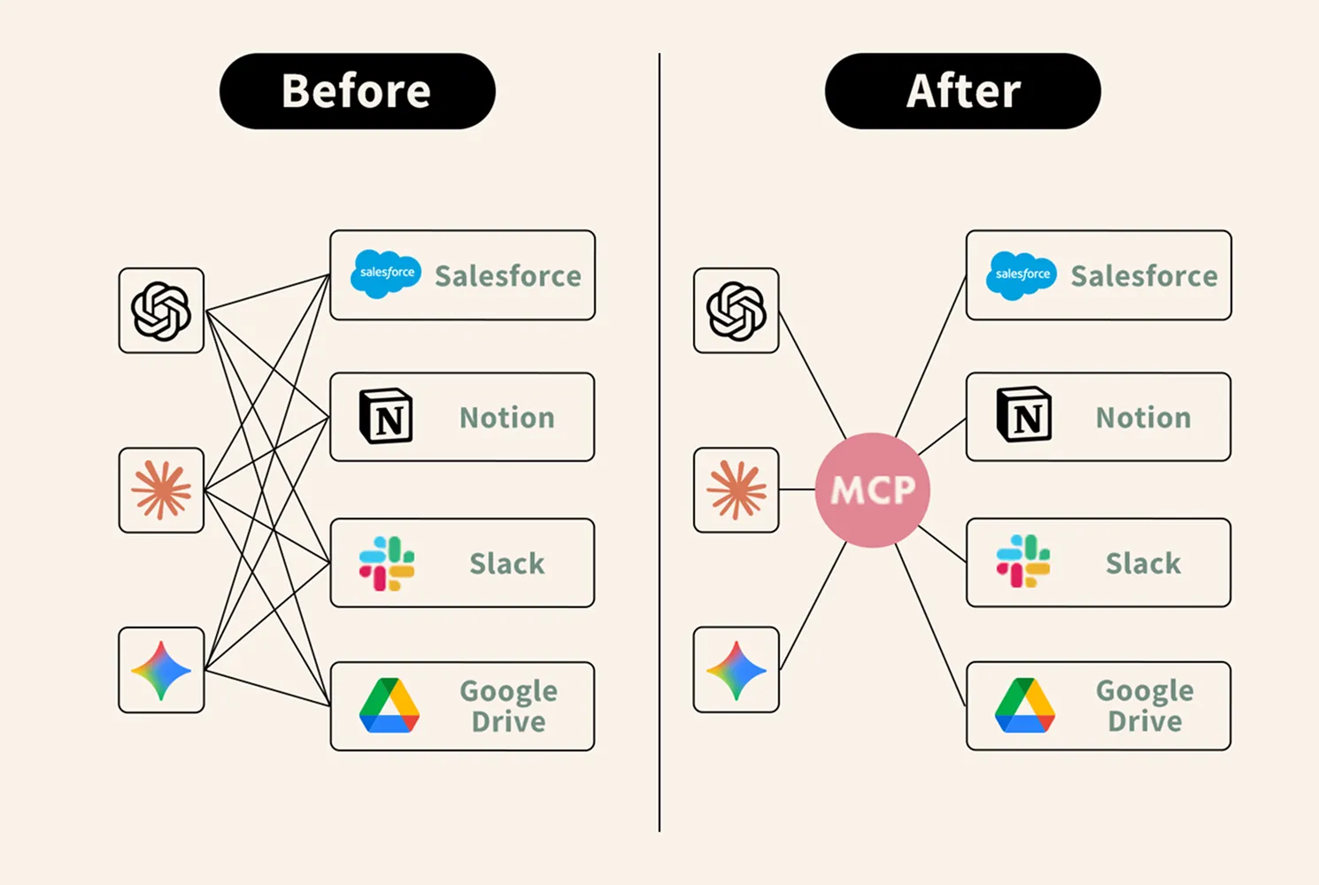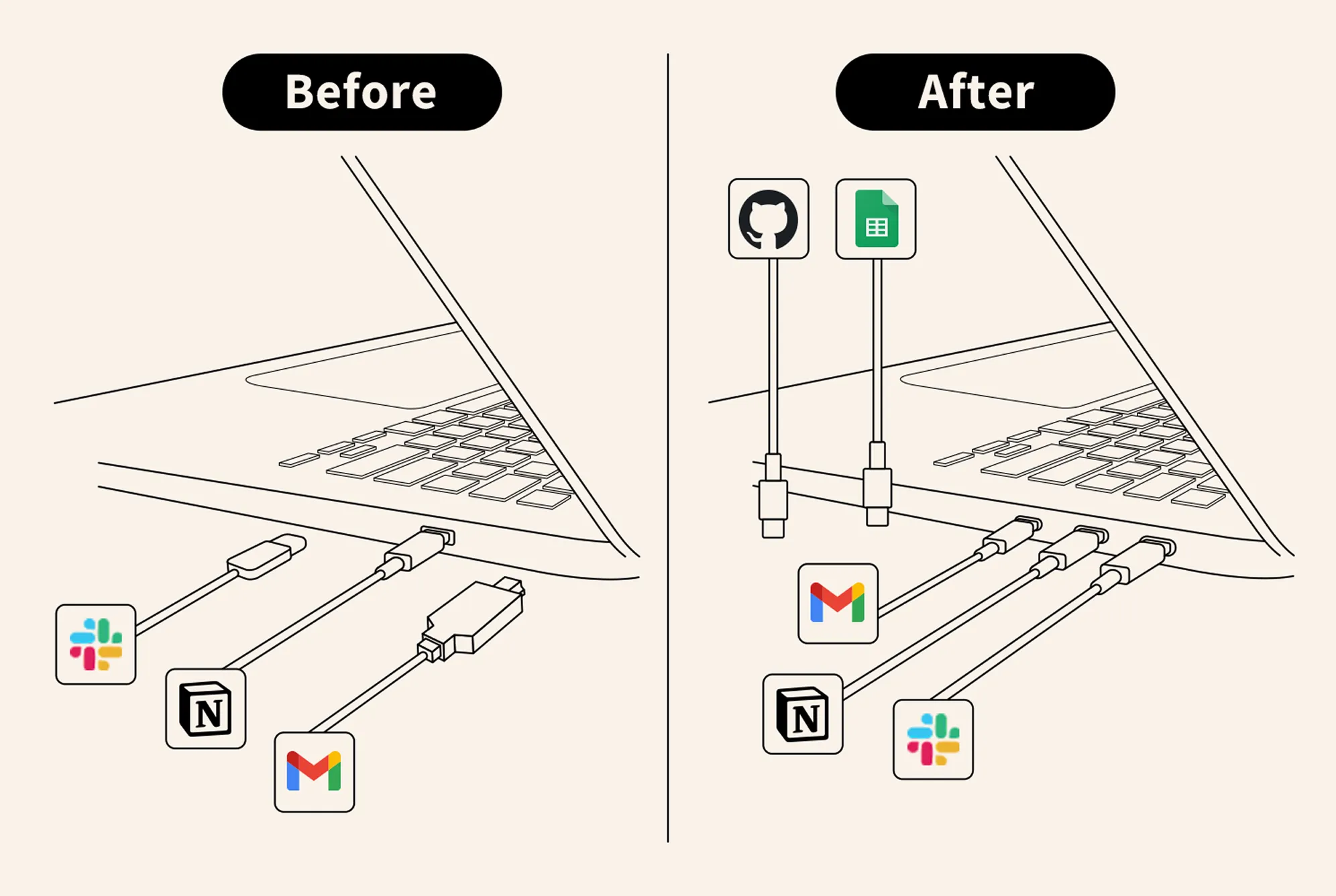例えば、ChatGPT・Claude・Gemini の3つのAIを、それぞれをSalesforce・Notion・Slack・Google Driveの4つのツールと連携させるためには、3×4=12回の個別実装が必要になります。