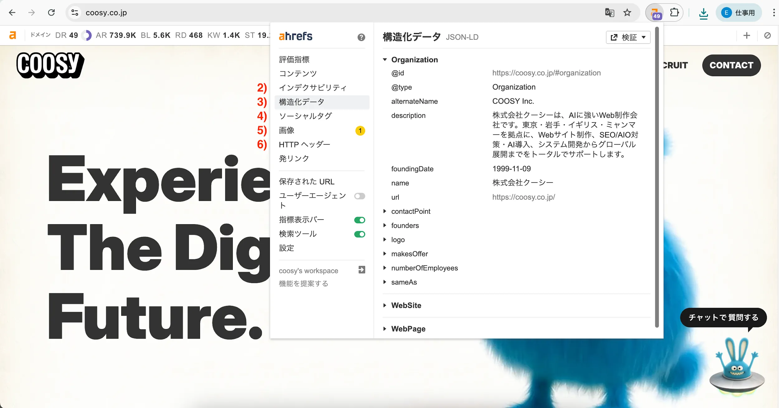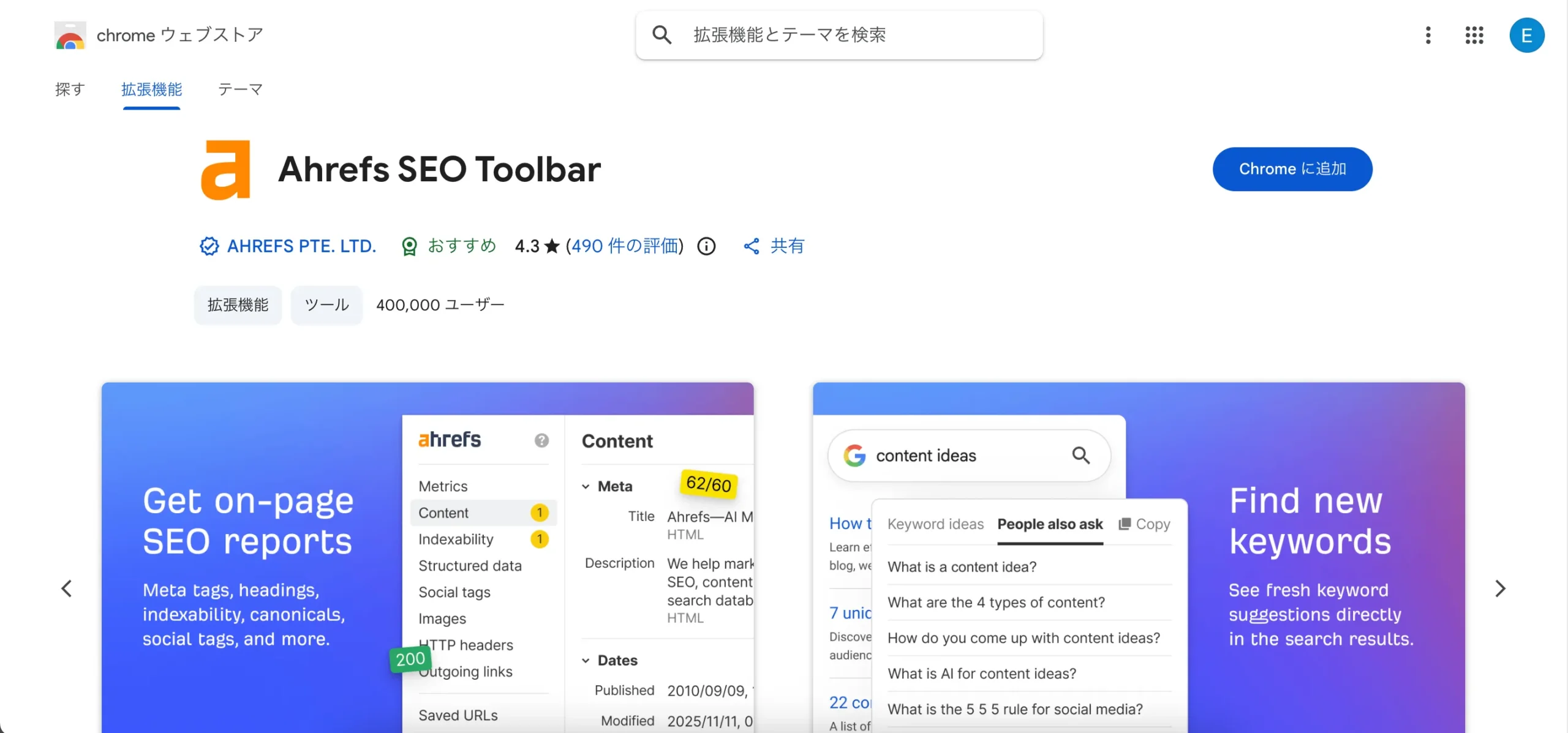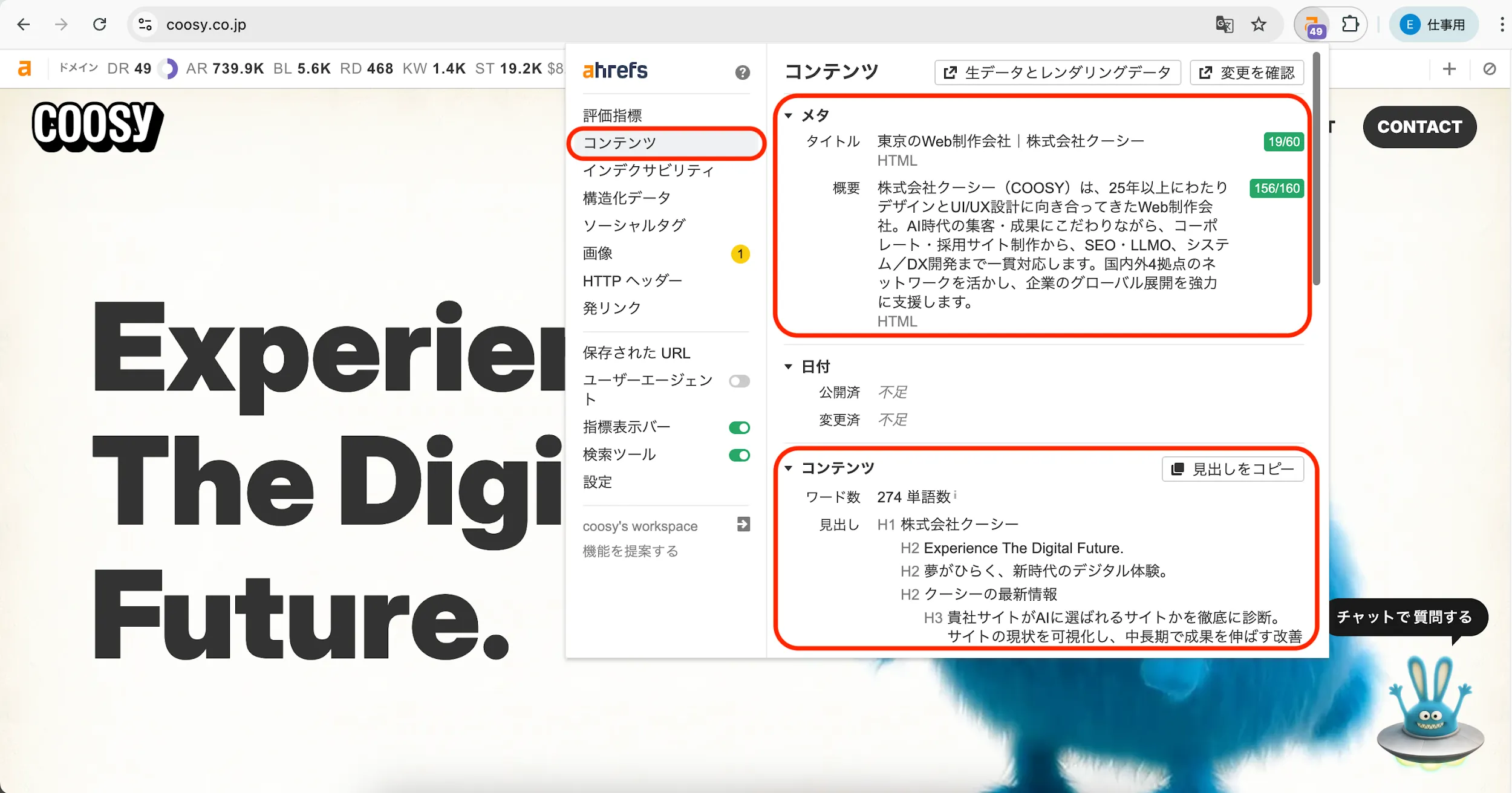 サイトのSEOを確認するために、わざわざ別の分析サイトを開くのは面倒ですよね。Ahrefsを使えば、今見ているページ上で、キーワードの強さやリンクの状態をパッと確認できるため、別の画面に切り替える手間がなくなり、作業に集中したまま分析を進められます。