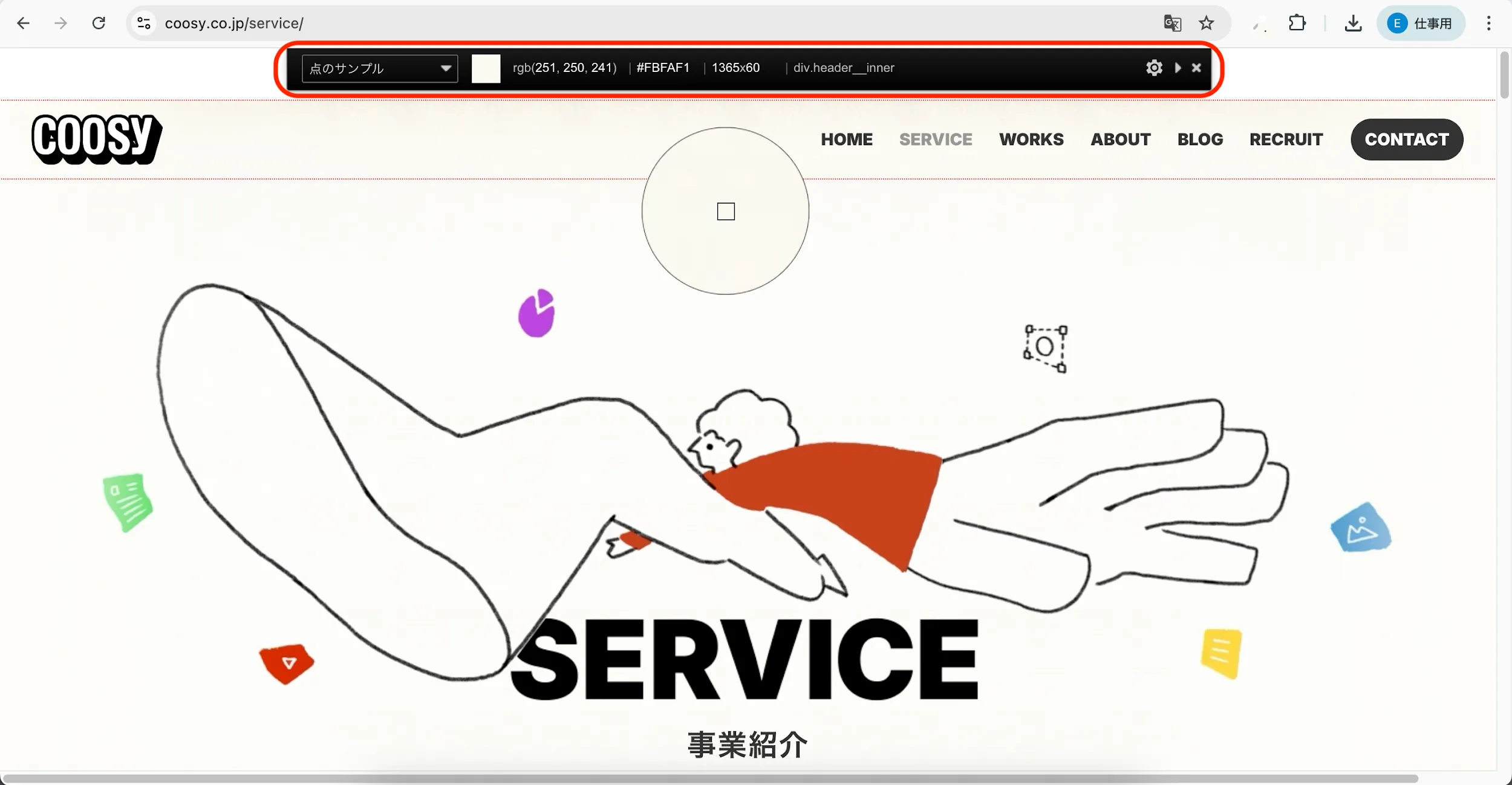 こちらは、Webページ上の気になる場所にマウスを当てるだけで、カラーコードを一瞬で取得・コピーできるツールです。