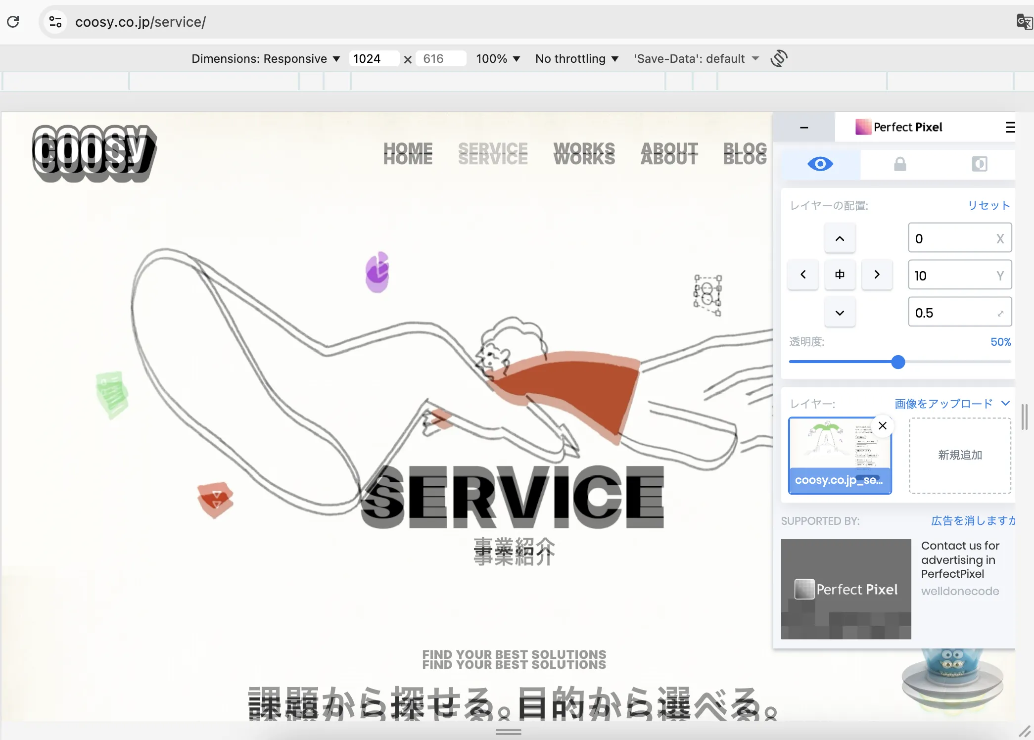 こちらは、デザイン案の画像をブラウザ上に「半透明」で重ね合わせ、コーディングとのズレを一目で確認できるツールです。