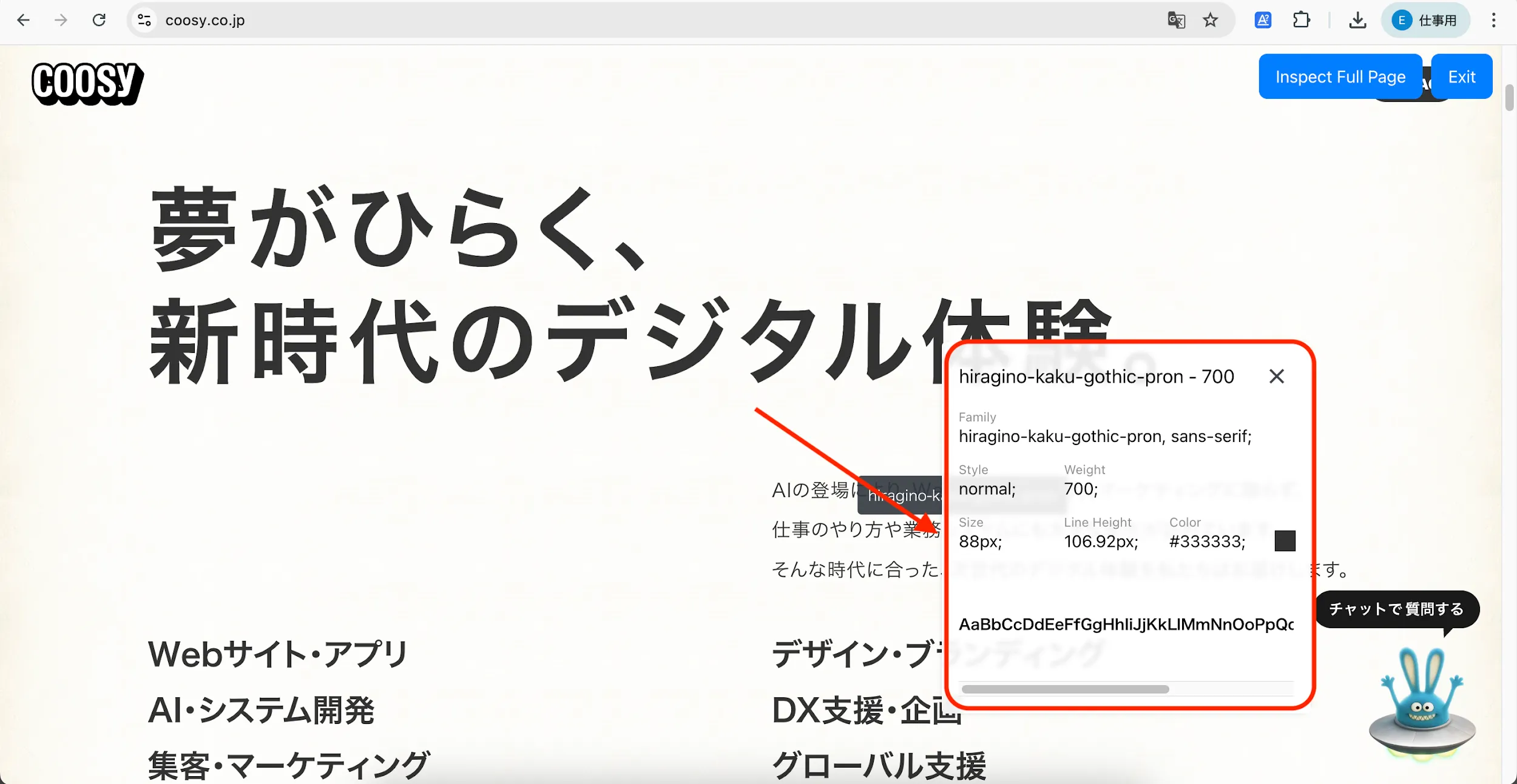 「このフォント、名前は何だろう?」と思ったら、マウスを当てるだけでフォント名やサイズを表示してくれます。わざわざ設定を詳しく調べなくても、タイポグラフィの情報をすぐに手に入れられるので、実装までのスピードがかなり上がります。