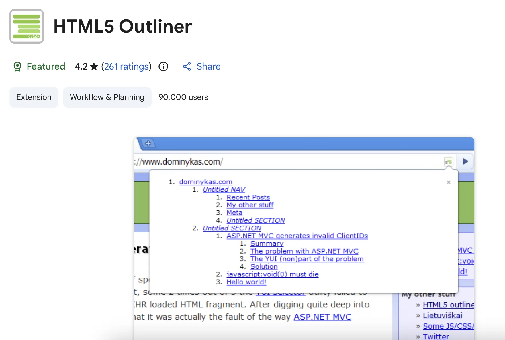 こちらは、Webページの見出し構造(アウトライン)が正しく設定されているかを、ワンクリックで目次のようにリスト化できるツールです。