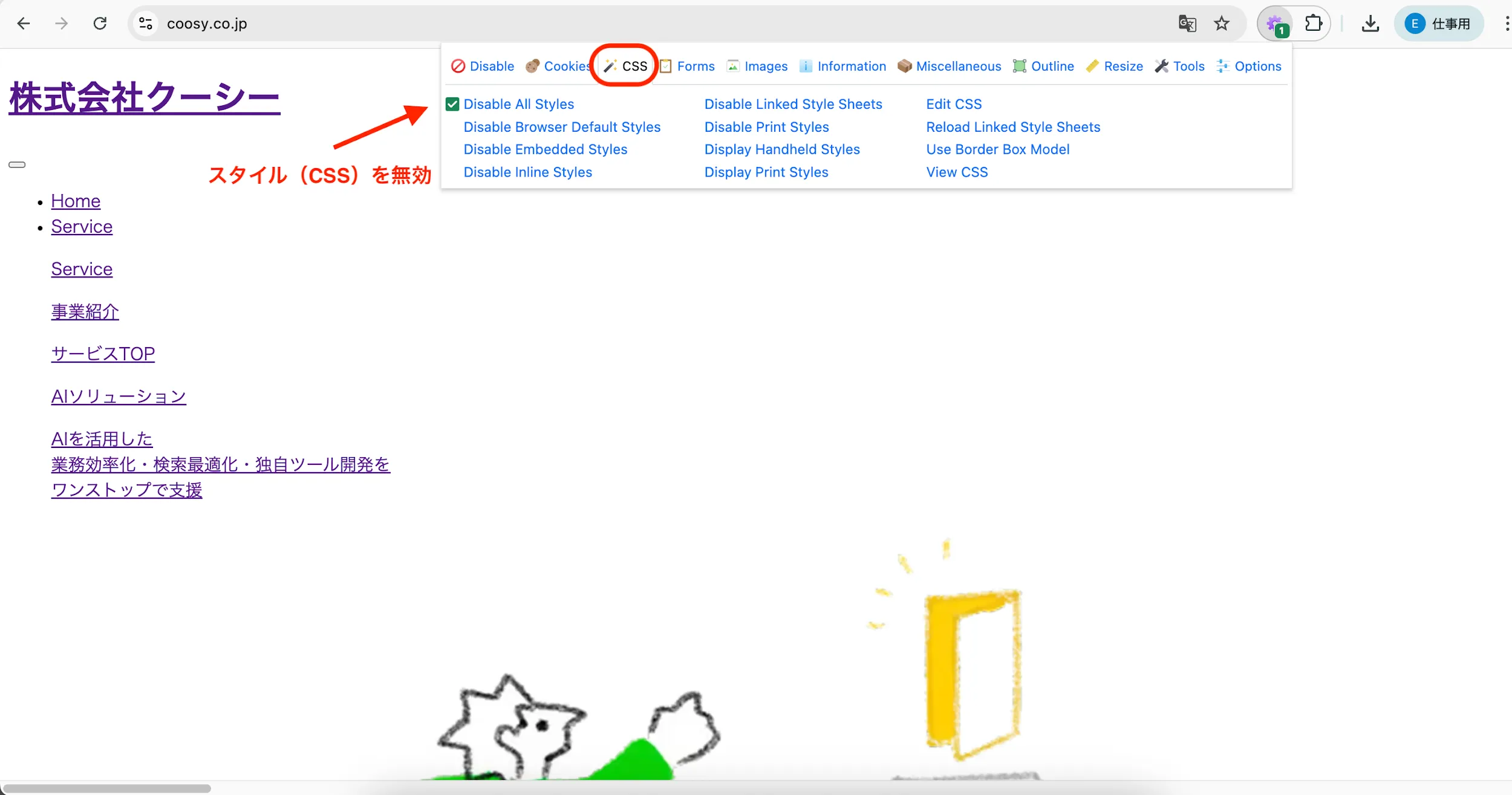 を選択するだけで、ページを装飾なしのHTML状態で表示できます。