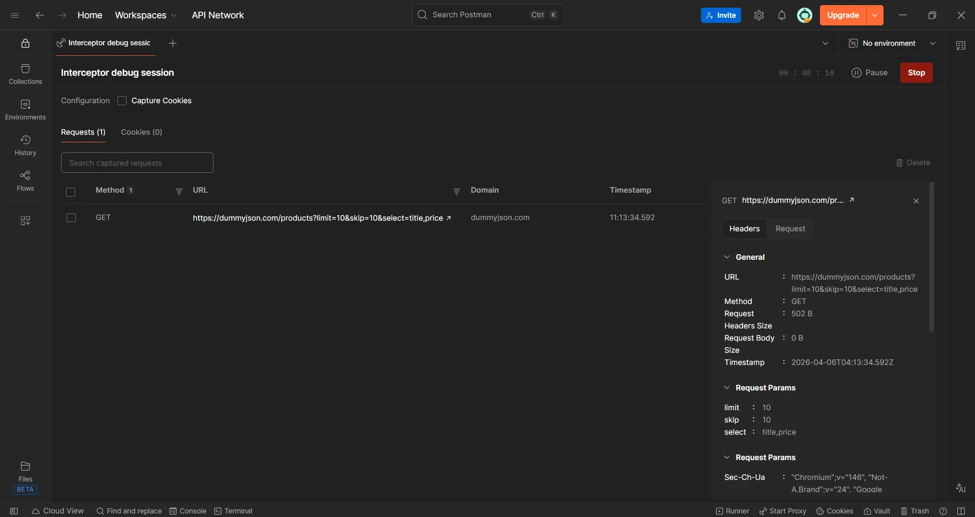 キャプチャされたすべてのリクエストは、Postmanアプリ内の「Interceptor debug session」にリアルタイムで表示されます。各リクエストのメソッド、URL、ステータスコードを一目で確認できます。