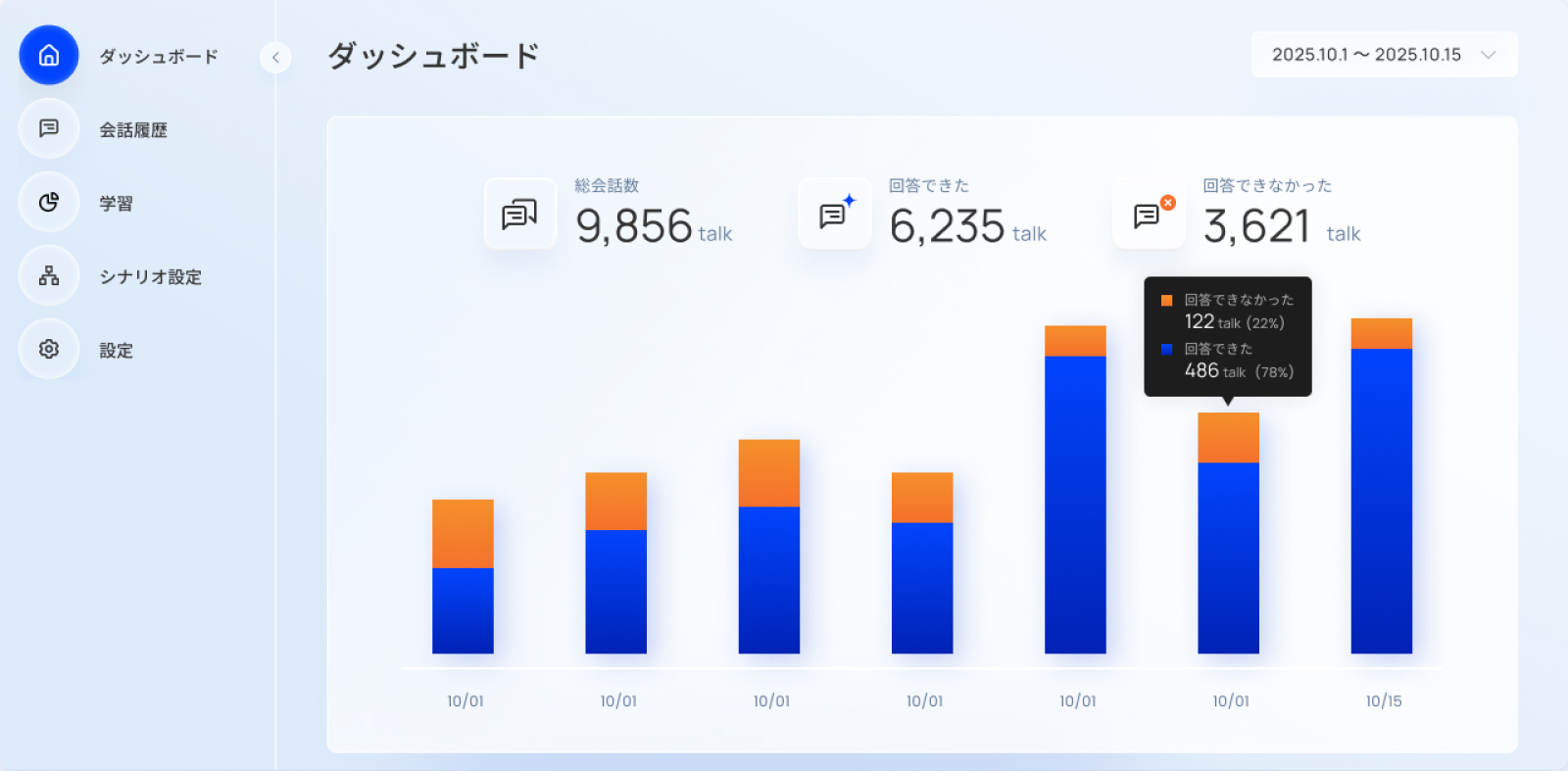 「サイトに情報がなく回答できなかった質問」を会話ログから自動抽出します。 これによって、ユーザーが求めている情報=サイト改善の最重要ヒントが可視化されます。